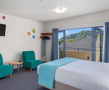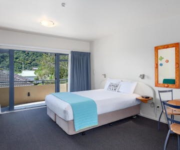 Large studio room with a king size bed and kitchenette. An ensuite bathroom with shower. These rooms are located on both the second and ground level of the complex.